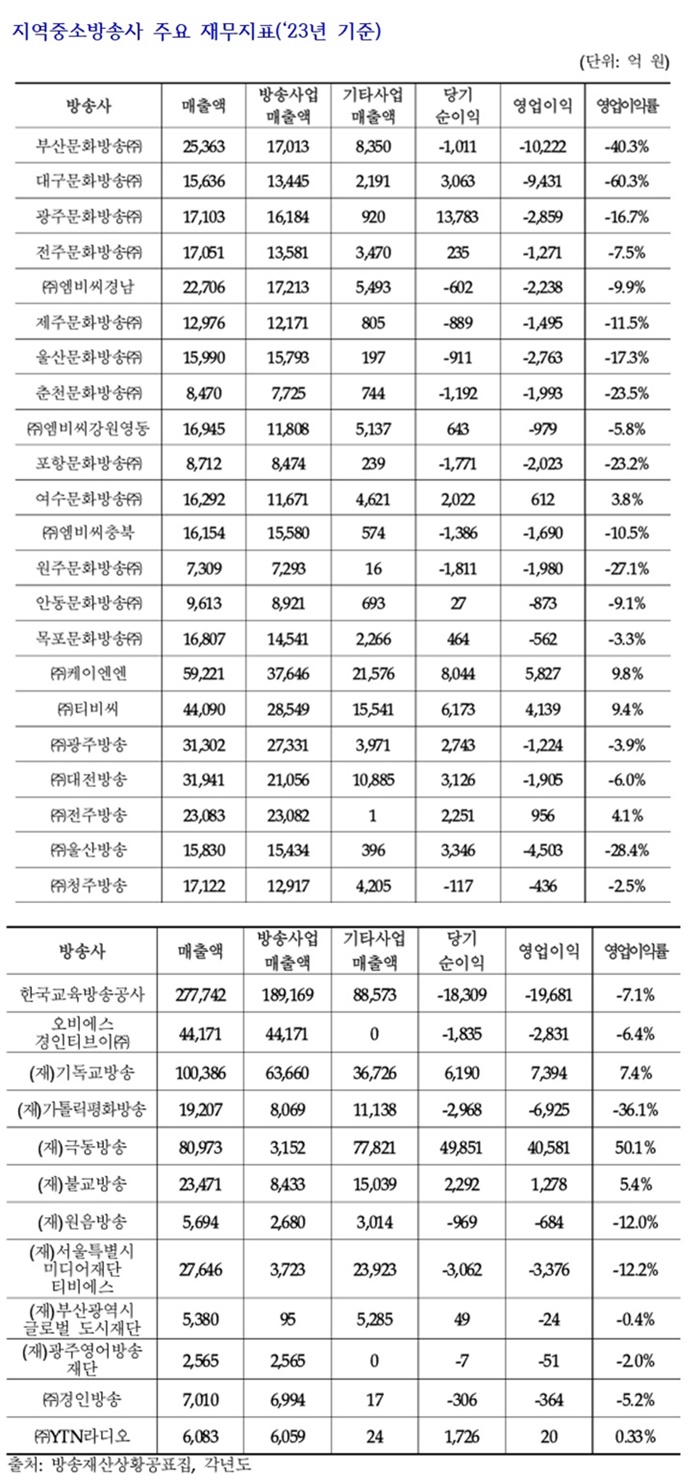 전체 34개 지역·중소방송 가운데 흑자 방송사는 8개(23.5%)뿐이며, 다수의 지역MBC가 심각한 적자 상태다.