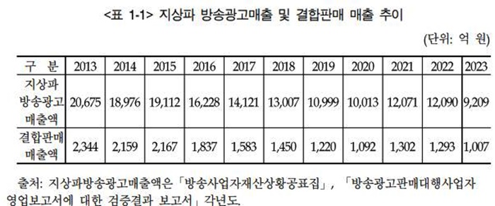 지상파 방송광고 매출은 2013년 2조 675억 원에서 2023년 9,209억 원으로 55.5% 급감한 것으로 나타났다.