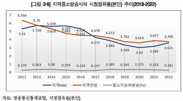 시청점유율 또한 지역MBC·지역민방이 각각 30~40% 하락했으며, 연평균 감소율은 –3.8%, –5.1%에 달했다.