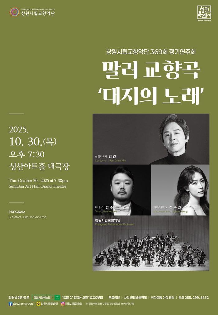 [시사코리아저널=정종민 선임기자] 창원시립교향악단(이하 창원시향)은 오는 10월 30일 성산아트홍 대극장에서 개최되는 369회 정기연주회에서 구스타프 말러(1860~1911)의 관현악, 테너, 알토 독창을 위한 작품인 '대지의 노래'를 연주한다..