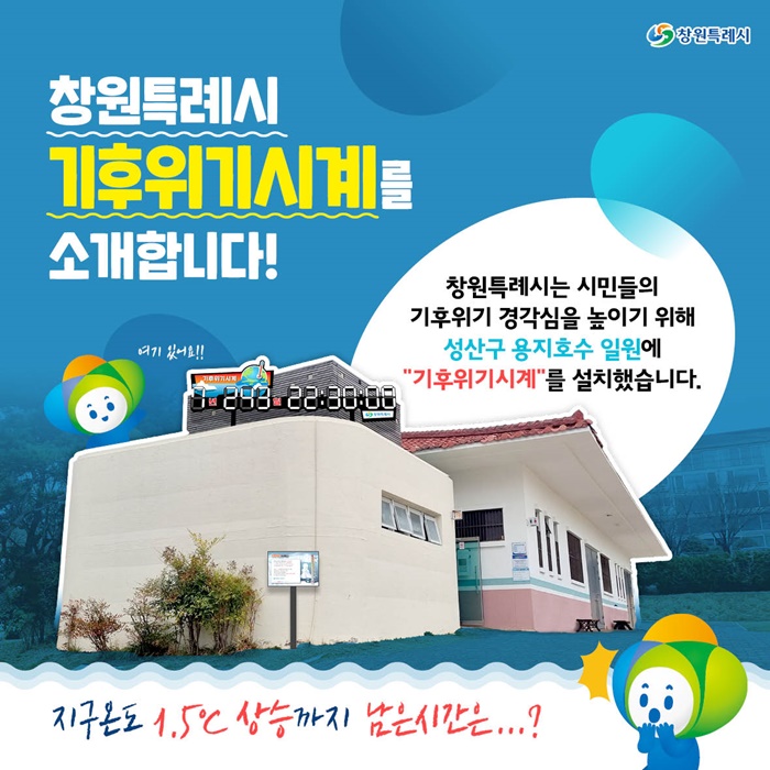 ‘기후위기 시계’는 지구 평균기온이 산업화 이전 대비 1.5℃ 상승하기까지 남은 시간을 실시간으로 표시하는 시계로, 창원시 성산구 용지호수 일원에 설치돼 있다.