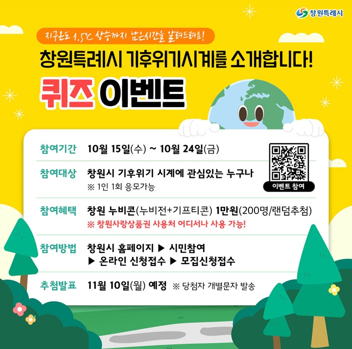 [시사코리아저널=정종민 선임기자] 창원시는 기후위기의 심각성을 알리고 시민의 관심과 참여를 독려하기 위해 기후위기 시계를 소개하는 퀴즈 이벤트를 개최한다고 15일 밝혔다.