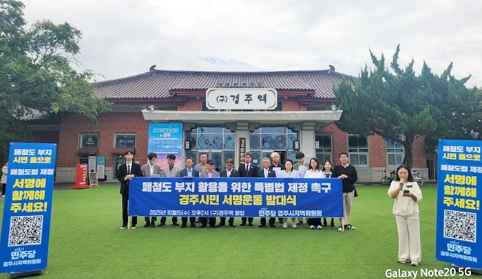 [시사코리아저널=경북취재본부] 더불어민주당 경주시지역위원회(위원장 한영태)는 지난 15일, 구 경주역 앞에서 ‘폐철도법 제정 촉구 시민 서명운동 발대식’을 열고, 경주시민이 직접 참여하는 입법 촉구 운동의 시작을 공식 선언했다.