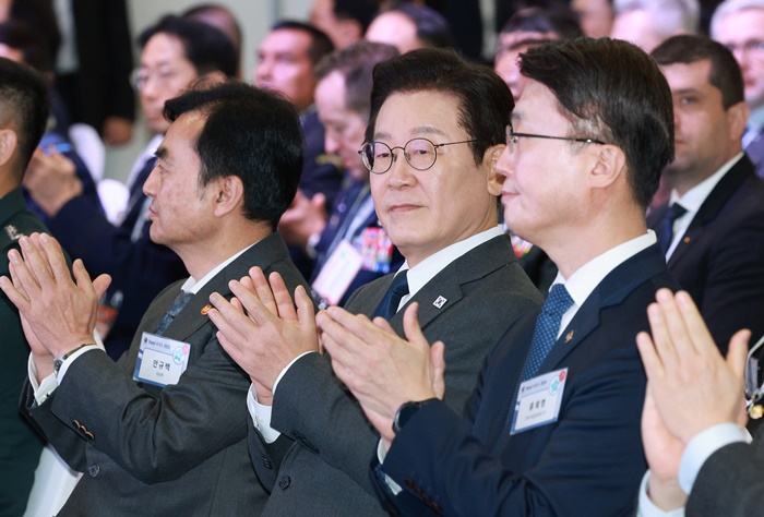 이재명 대통령이 20일 경기 고양시 킨텍스에서 열린 서울 ADEX 2025 개막식에서 참석자들과 박수를 치고 있다. /대통령실통신사진기자단 |