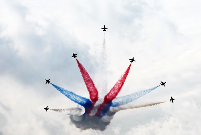 19일 경기도 성남시 서울공항에서 열린 '서울 국제항공우주 및 방위산업 전시회(ADEX)'에서 공군 특수비행팀 블랙이글스가 에어쇼를 선보이고 있다. /연합뉴스 |