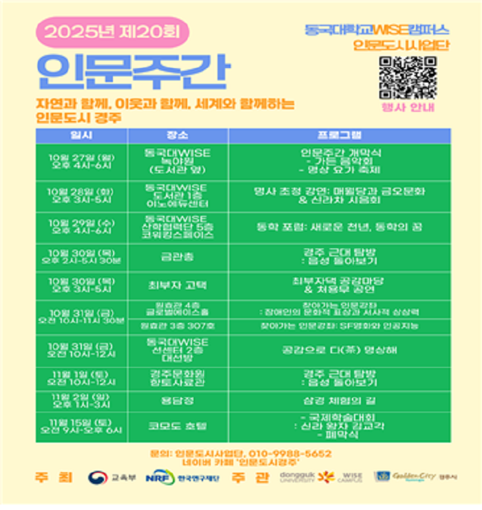 [시사코리아저널=경북취재본부] 동국대 WISE캠퍼스 인문도시사업단(단장 홍은숙)이 10월 27일부터 11월1일까지 동국대 WISE캠퍼스와 경주지역 일대에서 제20회 인문주간 행사를 개최한다고 밝혔다.