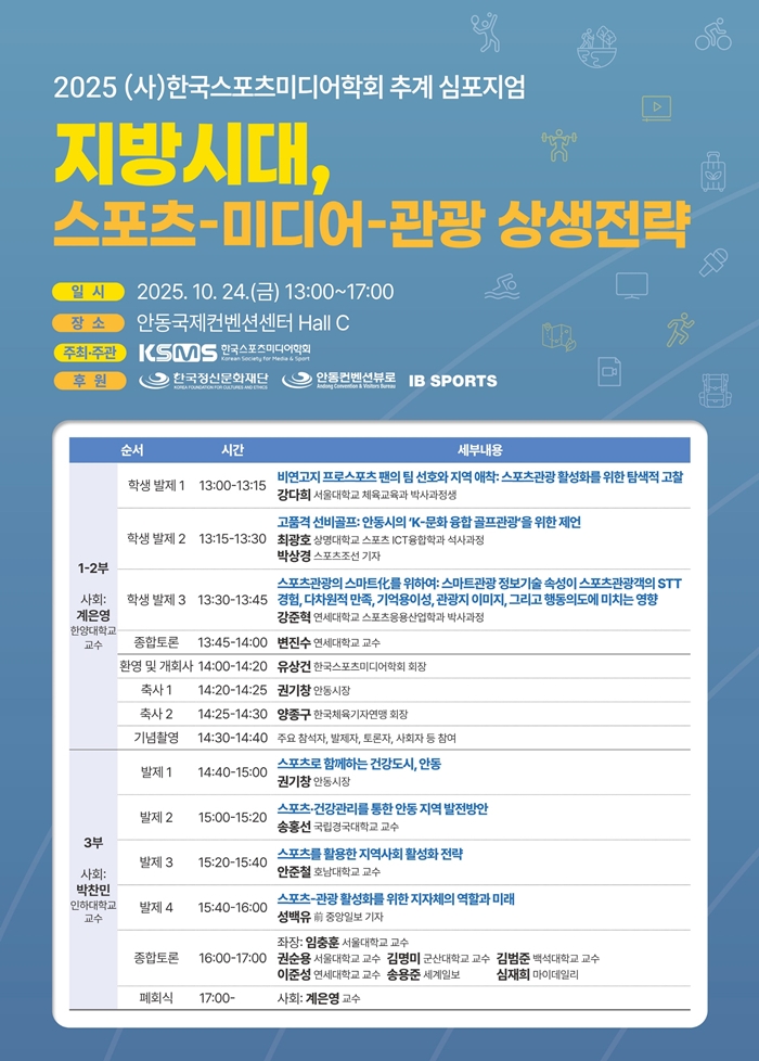 [시사코리아저널=김연학 기자] 한국스포츠미디어학회(회장 유상건, 상명대학교 교수)는 10월 24일(금) 오후 1시부터 안동국제컨벤션센터에서 ‘2025 추계 심포지엄’을 개최한다.
