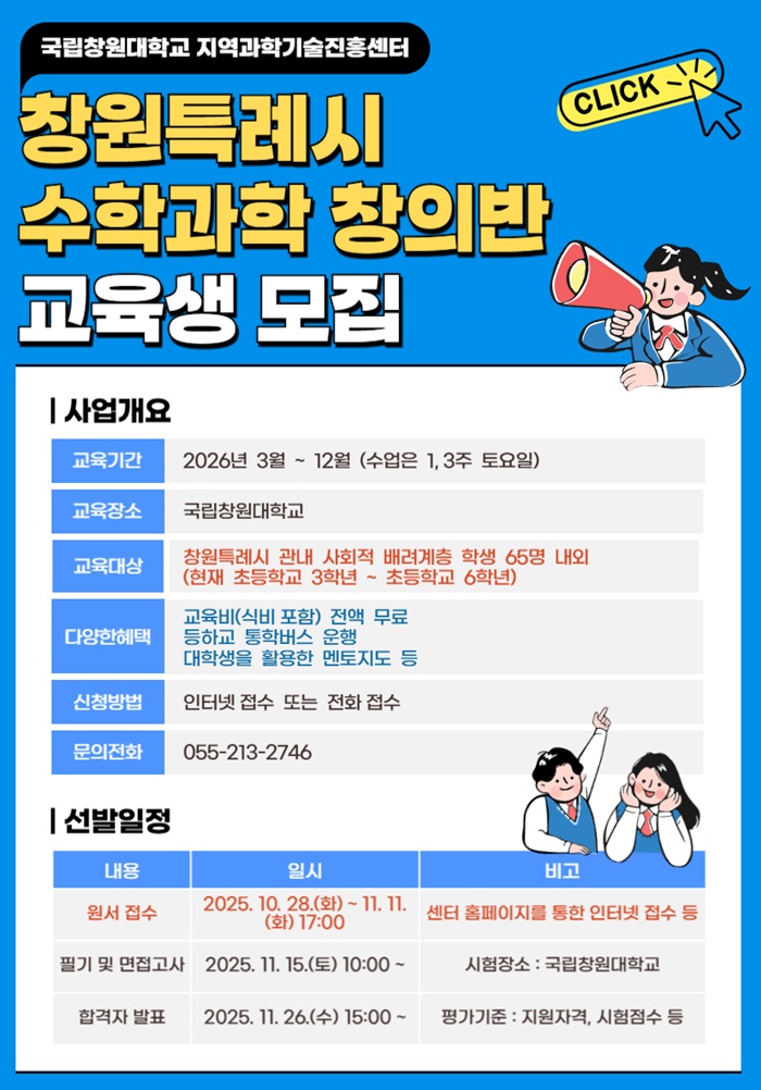 [시사코리아저널=정종민 선임기자] 창원시는 수학‧과학 분야에 재능이 있는 사회적 배려 계층 학생들에게 무상으로 양질의 교육 기회를 제공하는 ‘2026학년도 창원시 수학‧과학 창의반’ 수강생을 모집한다고 밝혔다.