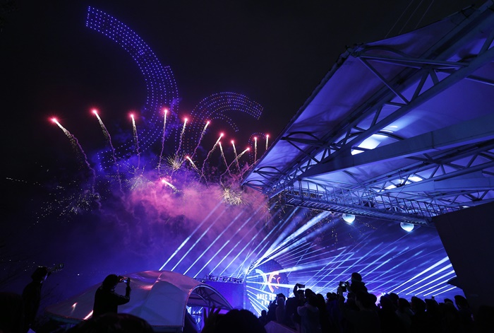 | 아시아태평양경제협력체(APEC) 정상회의 개최를 기념하는 멀티미디어쇼가 18일 오후 경북 경주시 보문호 수상 공연장에서 열리고 있다. /연합뉴스 |