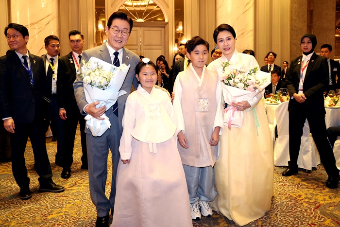 | 이재명 대통령과 김혜경 여사가 26일 말레이시아 쿠알라룸푸르 한 호텔에서 열린 동포 만찬 간담회에서 화동과 기념촬영을 하고 있다. /연합뉴스 |