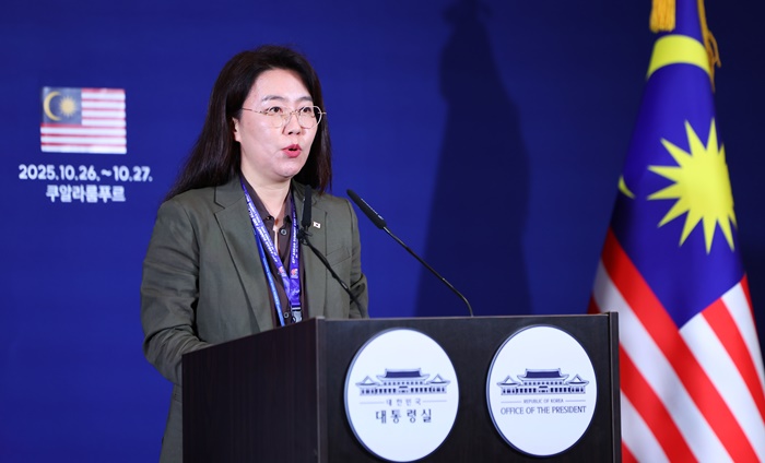 | 강유정 대통령실 대변인이 27일(현지시간) 말레이시아 쿠알라룸푸르 한 호텔에 마련된 한국 기자단 프레스센터에서 한-캄보디아 양자회담 및 한-아세안 정상회의 관 브리핑을 하고 있다. /연합뉴스 |