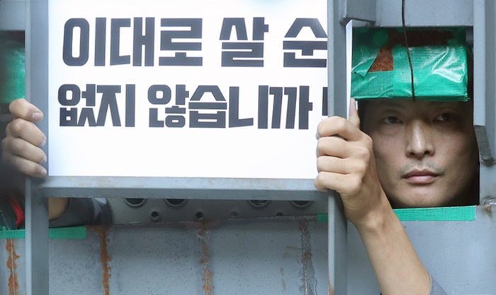 | 2022년 7월 19일 유최안 당시 금속노조 거제통영고성 조선하청지회 부지회장이 경남 거제시 아주동 대우조선해양 옥포조선소 파업 현장 내 독 화물창 바닥에 가로, 세로, 높이 각 1m 철 구조물 안에서 농성 중이다. /자료사진 |