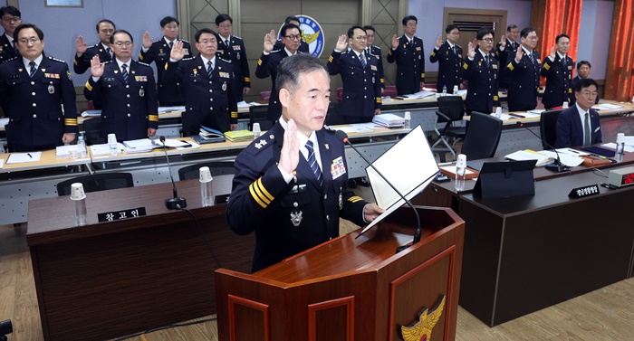 | 경남경찰청 김종철 청장이 28일 오후 경남경찰청에서 열린 국회 행정안전위원회 경남경찰청 국감에서 선서하고 있다. /연합뉴스 |