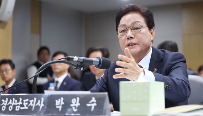 | 박완수 경남도지사가 28일 오전 경남도청에서 열린 국회 행정안전위원회 경남도청 국감에서 의원 질의에 답변하고 있다 |