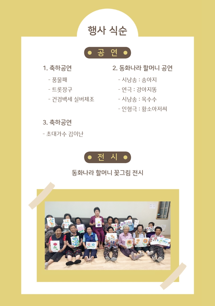 이날 행사에서는 지역 풍물패와 트롯장구 공연을 비롯해 초대가수 축하무대가 펼쳐지며, 주민들이 직접 준비한 시 낭송, 연극, 인형극 등 ‘동화나라 할머니 공연’이 이어진다. 또한 주민들이 손수 제작한 동화나라 할머니 꽃그림 전시회도 함께 열려, 마을 예술교육의 따뜻한 결실을 선보일 예정이다.