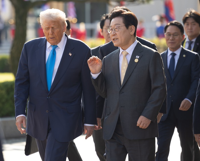 | 이재명 대통령과 도널드 트럼프 미국 대통령이 29일 경북 경주박물관에서 정상회담장으로 이동하며 대화하고 있다. /대통령실 제공 |