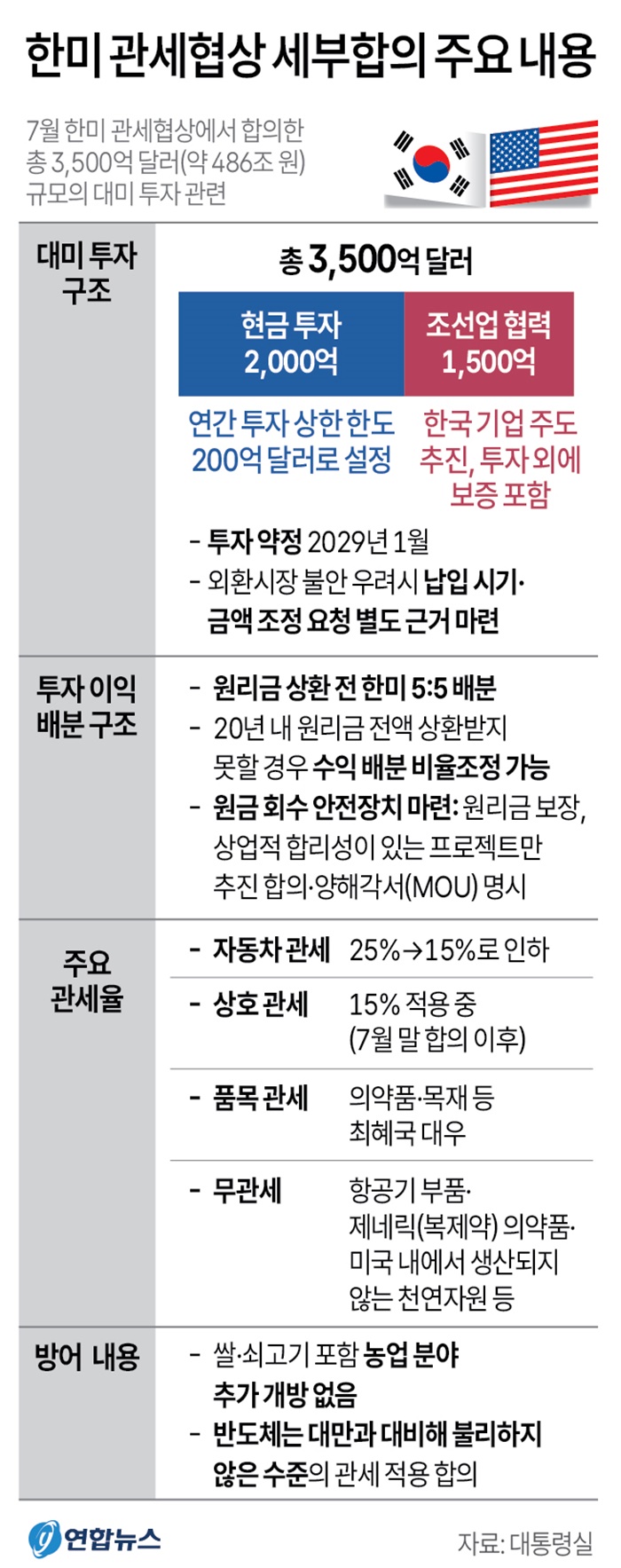 김 실장은 "대미 금융투자 3천500억 달러는 현금 투자 2천억 달러와 조선업 협력 1천500억 달러로 구성된다"며 "일본이 미국과 합의한 5천500억 달러 금융 패키지와 유사한 구조이지만 우리는 연간 투자 상한을 200억 달러로 설정했다"고 밝혔다.