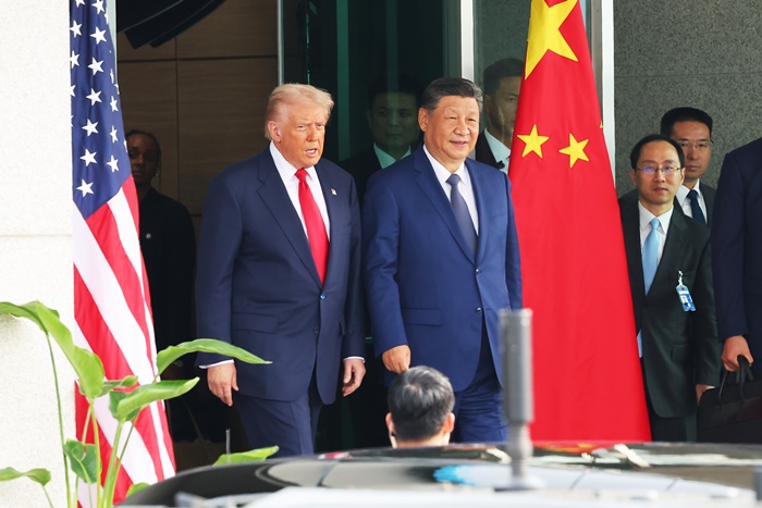 | 도널드 트럼프 미국 대통령과 시진핑 중국 국가주석이 30일 부산 공군 제5공중기동비행단 내 나래마루에서 미중 정상회담을 마친 뒤 회담장을 나서고 있다. /연합뉴스 |