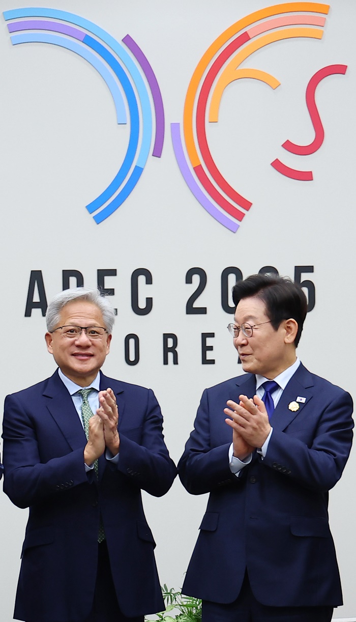| 이재명 대통령과 젠슨 황 엔비디아 최고경영자가 31일 APEC 정상회의장인 경북 경주화백컨벤션센터에서 면담 전 기념촬영을 하고 있다. /연합뉴스 |