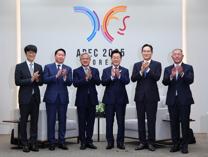 | 이재명 대통령이 31일 APEC 정상회의장인 경주화백컨벤션센터에서 젠슨 황 엔비디아 최고경영자 접견에 앞서 국내 기업 대표들과 함께 기념촬영을 하고 있다. /연합뉴스 |