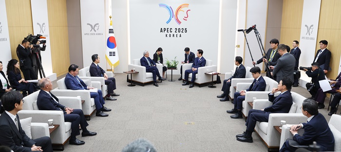 | 이재명 대통령이 31일 APEC 정상회의장인 경주화백컨벤션센터에서 젠슨 황 엔비디아 최고경영자를 접견하고 있다. /연합뉴스 |