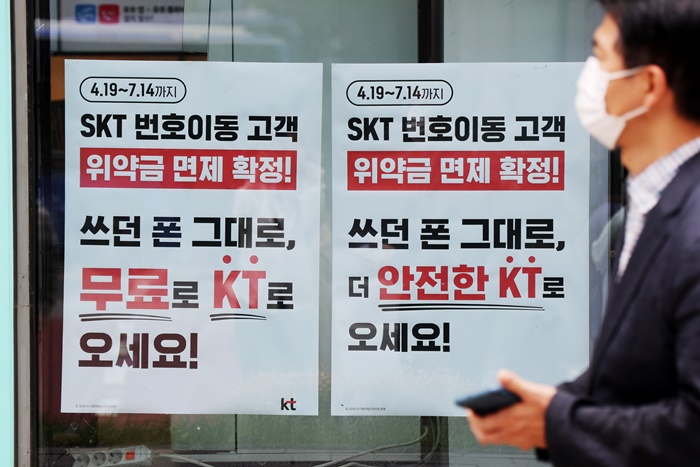 | SK텔레콤이 지난 4월 발생한 해킹 사태 이후 통신사를 변경하는 가입자에 대한 위약금 면제를 결정한 가운데 지난 7월 6일 서울 시내의 한 KT 매장에 SK텔레콤 번호이동 고객에 대한 위약금 면제 안내문이 붙어있다. /연합뉴스 자료사진 |