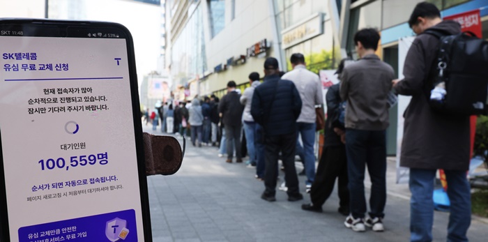 | SK텔레콤이 유심 고객정보 해킹 사고로 관련 유심 무료 교체 서비스에 나선 지난 4월 28일 서울 시내 한 SK텔레콤 대리점 앞에서 한 고객이 유심 교체 예약을 QR코드로 등록하자 대기인원이 10만명 이상으로 나타나있다. /연합뉴스 자료사진 |