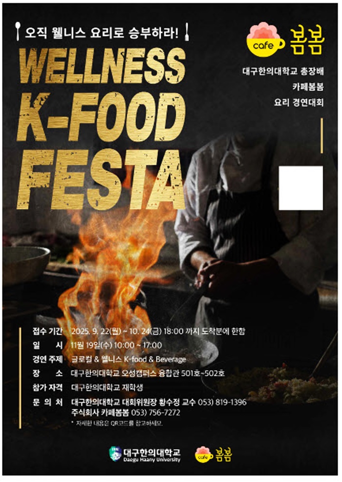 [시사코리아저널=이환수 기자] 대구한의대학교 총장배 카페봄봄 요리경연대회가 '글로컬 & 웰니스 K-Food & Beverage' 주제로 오는 11월 19일 오전 10시부터 대구한의대학교 오성캠퍼스 융합관 501~502호에서 개최된다.