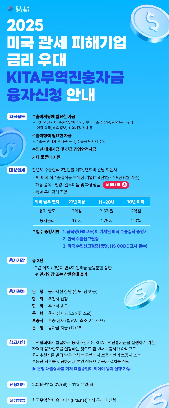 지원 대상은 전년도 수출실적 2천만불 이하의 한국무역협회 회비 완납 회원사로서, 철강·알루미늄 및 관련 파생상품을 2024년 1월부터 2025년 6월까지 미국 직수출한 실적을 보유한 기업이다.