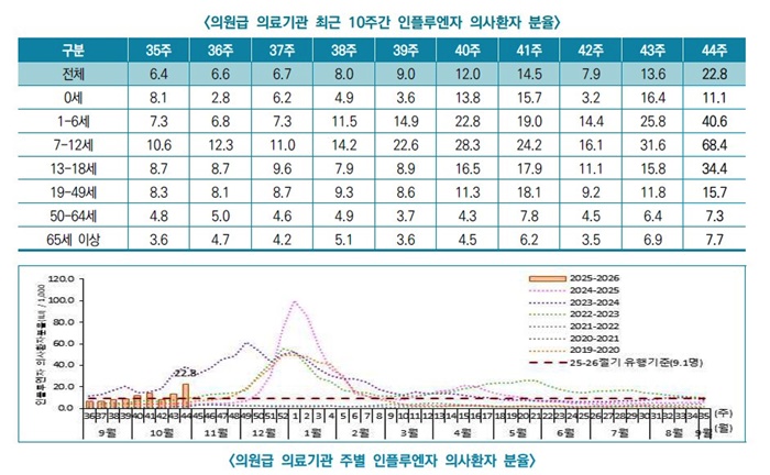 올해는 작년보다 독감 유행이 두 달가량 빨리 찾아온 탓에 작년 이맘때(2024년 44주차)의 독감 증상 환자 수(1천 명당 3.9명)와 비교하면 올해가 5.8배가량 많다.