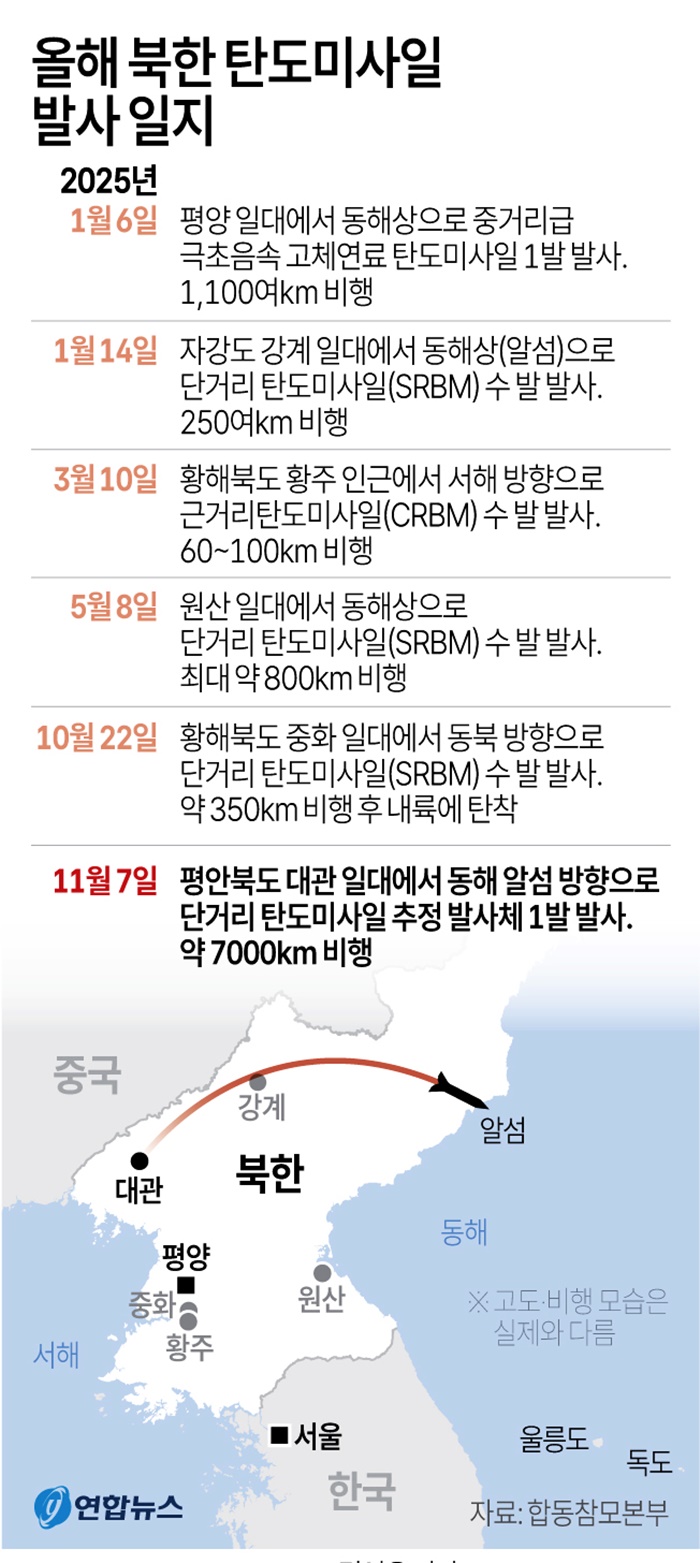 북한의 탄도미사일 도발은 지난달 22일 이후 16일 만이며, 올해 6번째다. 이재명 정부 출범 후로는 두 번째다.