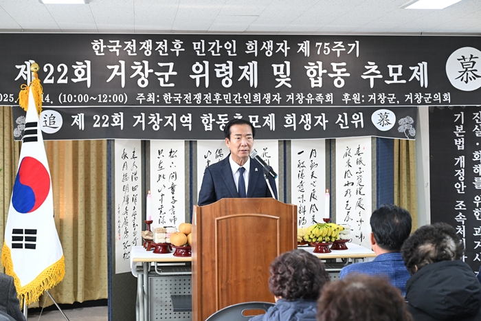 행사에는 구인모 군수, 경상남도의회 박주언 문화복지위원장, 김일수 도의원, 강창남 대한노인회 거창군지회장 등이 자리를 함께해 희생자들에 대한 깊은 애도의 뜻을 표하고 유족들에게 진심 어린 위로의 마음을 전했다.