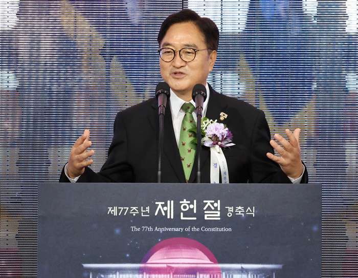 | 우원식 국회의장이 지난 7월 17일 서울 여의도 국회에서 열린 제77주년 제헌절 경축식에서 경축사를 하고 있다. /국회사진기자단 |