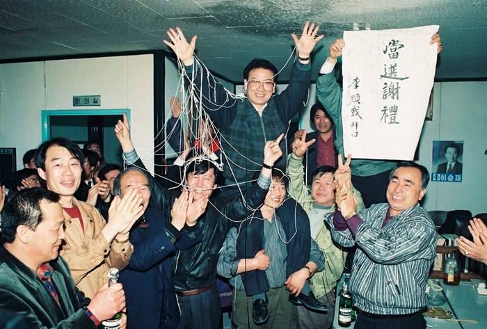 | 1992년 14대 총선에서 당시 여당인 민주자유당 후보로 서울 중랑갑 선거구에 출마해 당선 축하를 받는 모습. /연합뉴스 자료사진 |