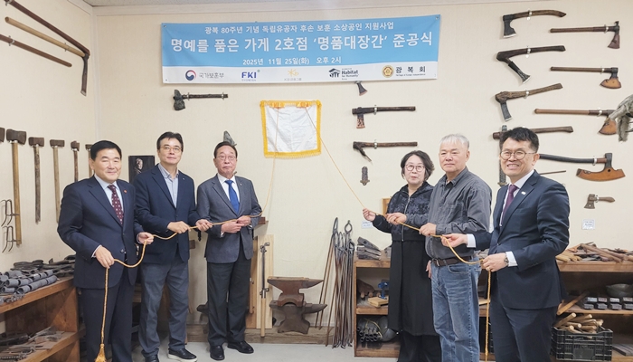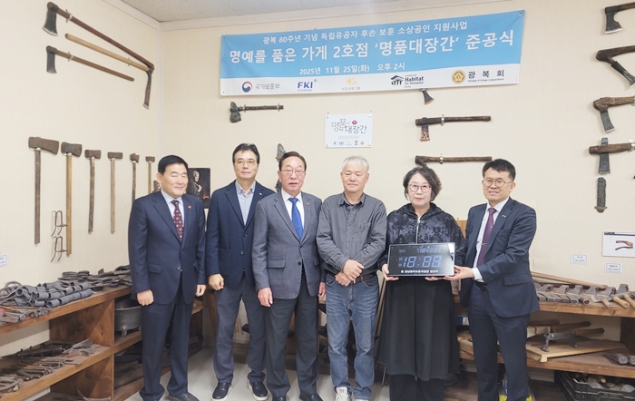 [시사코리아저널=이환수 기자] 경남동부보훈지청(지청장 김상우)은 광복 80년을 맞아 한국경제인협회, 광복회, 한국해비타트 등과 함께 독립유공자 조소앙 선생 손녀가 운영하는 대장간(경남 의령군 소재)에서 2호 명품가게(명예를 품은 가게) 현판식을 가졌다.