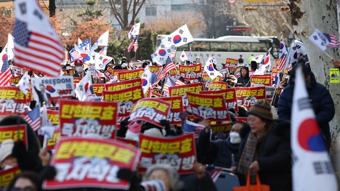 | 윤석열 대통령 탄핵심판 8차 변론이 열린 지난 2월 13일 서울 종로구 안국역사거리에서 대한민국바로세우기국민운동본부(대국본) 및 윤석열 대통령 지지자들이 탄핵 반대 집회를 하고 있다. /자료사진 |