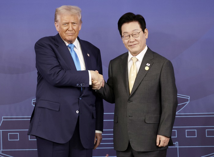 | 이재명 대통령과 도널드 트럼프 미국 대통령이 지난 10월 29일 경북 경주박물관에서 한미 정상회담 기념촬영을 하고 있다. /대통령실통신사진기자단 |