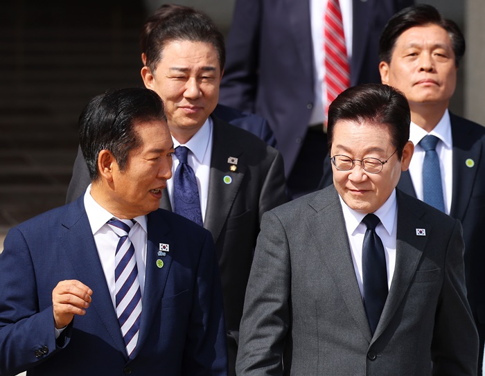 | 유엔총회 참석차 출국하는 이재명 대통령이 지난 9월 22일 성남 서울공항에서 공군 1호기로 향하며 더불어민주당 정청래 대표와 대화하고 있다. /연합뉴스 |