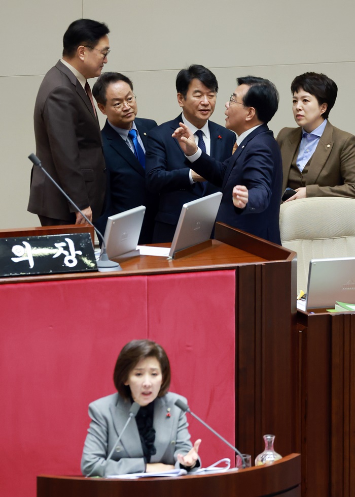 우 의장은 연단에 복귀한 나 의원이 국회의장을 향한 인사를 또 건너뛰었다고 지적했고, 국민의힘은 발언권 박탈에 대한 재발 방지 약속과 사과부터 하라며 맞받았다. 그러자 민주당 의석에서는 "내란 동조 정당", "적반하장" 등의 비난이 터져 나왔다.