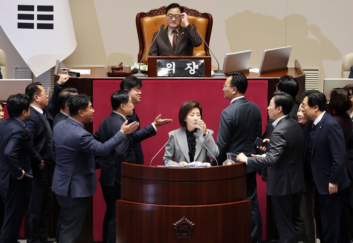 [시사코리아저널=정종민 선임기자] 올해 정기국회 마지막 날인 9일 본회의는 국민의힘 나경원 의원이 필리버스터(무제한 토론을 통한 합법적인 의사진행 방해)에 나선 지 13분 만에 우원식 국회의장이 마이크를 끄면서 고성과 항의, 막말로 아수라장이 됐다.