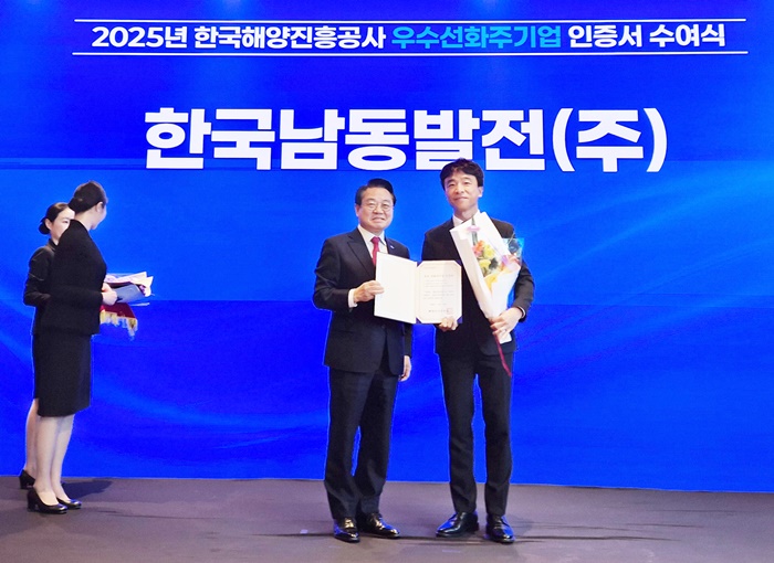 | 10일 부산에서 열린 2025년 한국해양진흥공사 우수 선화주 기업 인증서 수여식에서 한국남동발전이 우수 선화주 기업인증을 받았다. /한국남동발전 제공 |