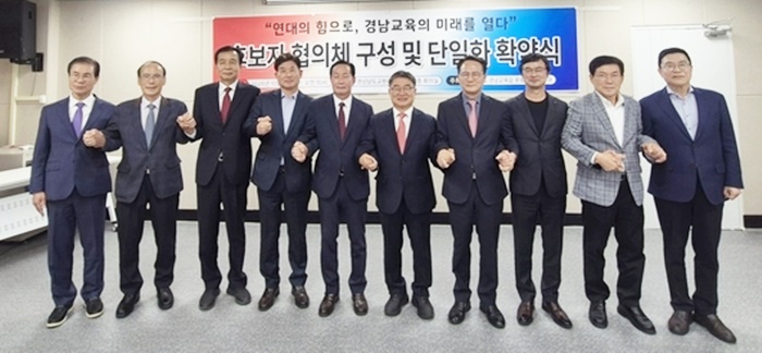 | 지난 10월 22일 경남교원총연합회관에서 열린 경남교육감 보수·중도 단일화 연대 회의 및 확약식에서 참여자들이 기념촬영을 하고 있다. 당시 출마 예정자 10명이 참석했지만 최종 7명이 1차 여론조사에 참여했다. |