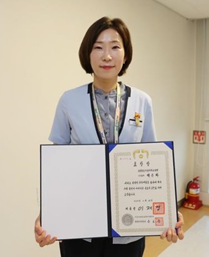 표창을 수상한 백은화 수간호사는 감염관리전담자로 13년간 근무하며 의료관련 감염병 예방관리 사업운영 및 CRE 등 의료관련감염병의 적극적인 감시와 선제격리 등 국민건강 향상에 기여한 공로를 인정받아 수상했다.