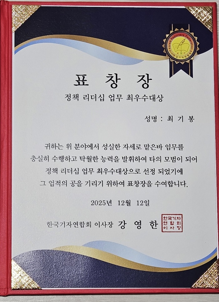 한국기자연합회 관계자는 “최 전 보좌관은 책임감과 전문성을 겸비해 정책 업무 수행의 모범을 보여주었으며, 이번 수상은 그의 헌신과 성과를 공식적으로 인정하는 자리”라고 밝혔다.