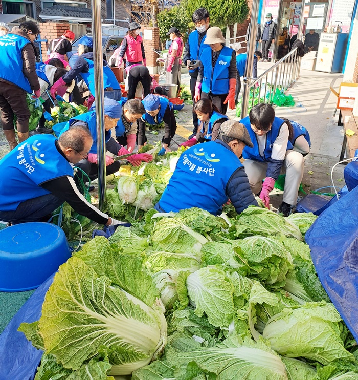 - 직접 재배한 배추 기증하고 봉사단원들은 배추 다듬고, 절이기에 ‘구슬땀’