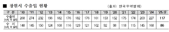 같은 기간 무역수지 흑자 규모는 86억 달러로 2012년 상반기 이후 13년 만에 가장 컸다. 창원지역의 무역수지 흑자액은 광역, 기초 단위 지자체를 포함해 전국에서 네 번째로 높았다.