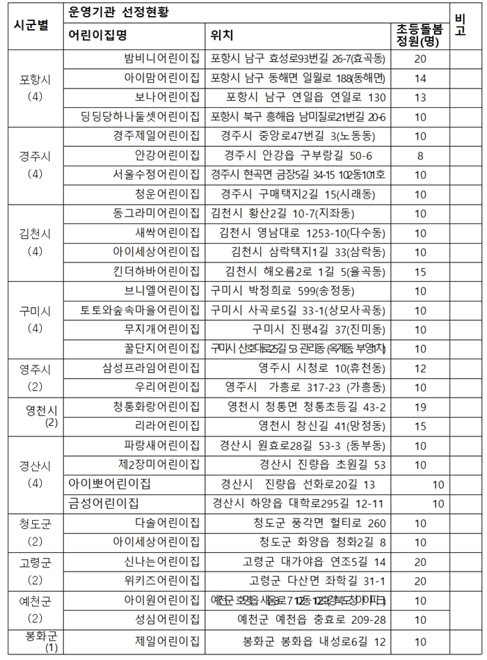 경북도는 선정된 어린이집에 인건비와 운영비를 지원하고, 초등 돌봄을 위한 별도 보육교사를 채용해서 아동 안전과 생활지도를 강화할 계획이다.