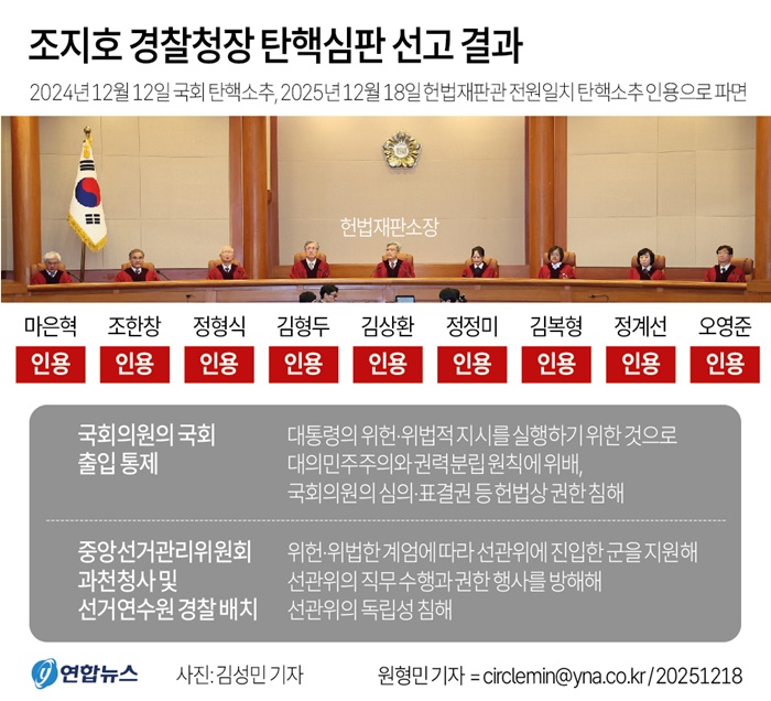 [시사코리아저널=김연학 기자] 헌법재판소가 18일 조지호 경찰청장을 파면했다.