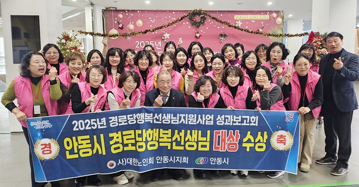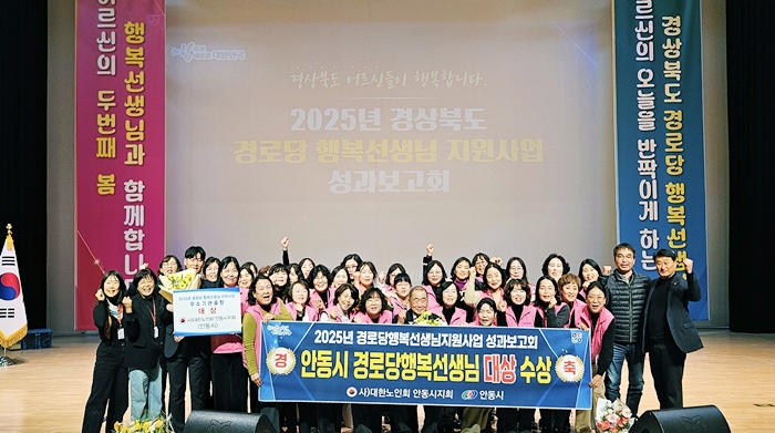 [시사코리아저널=김연학 기자] 안동시와 (사)대한노인회 안동시지회는 지난 18일, 경상북도가 경북도청 동락관에서 개최한 ‘경로당 행복선생님 지원사업 2025년도 성과보고회’에서, 도내 22개 수행기관을 대상으로 한 사업평가 결과 ‘대상’을 수상하는 영예를 안았다.