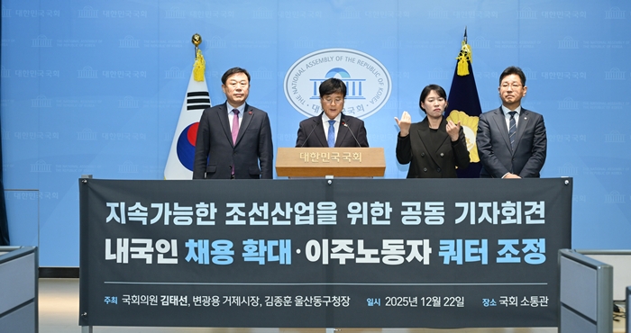 [시사코리아저널=정종민 선임기자] 변광용 거제시장은 지난 22일 김태선 국회의원(울산동구, 환경노동위), 김종훈 울산 동구청장과 함께 국회 소통관에서 기자회견을 열고, ‘조선산업기본법’ 제정, 내국인 채용 확대, 외국인 쿼터 축소를 골자로 한 고용구조 전환의 필요성을 정부에 촉구했다.